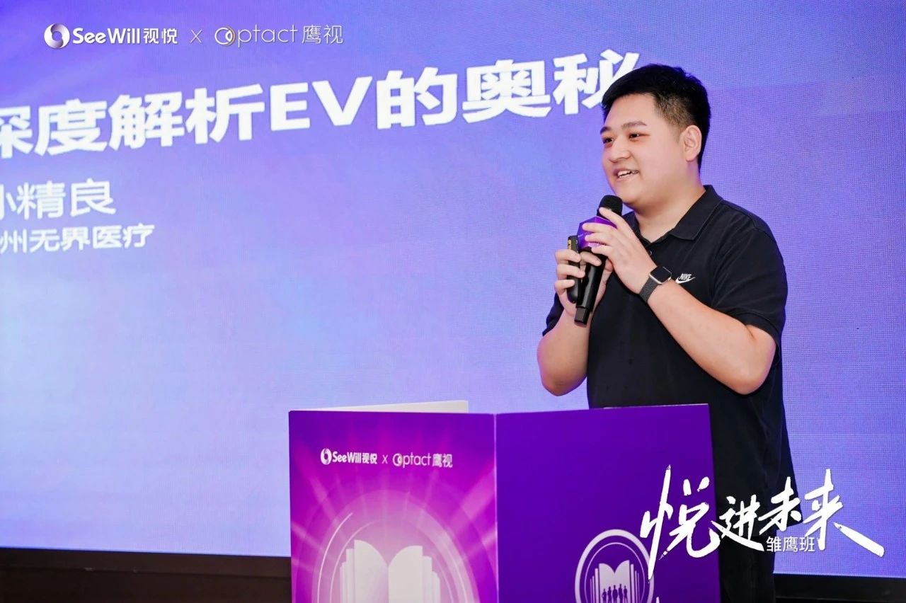 其後,來自杭州無界醫療的孫精良主任對鷹視EV系列角膜塑形鏡產品進行了深入分析。孫精良主任介紹EV系列角膜塑形鏡的設計是基於2000隻角膜數據的精準分析,各區弧度與弧寬堪稱“黃金搭配”,確保了與角膜的高度匹配。其AC非球面設計、各弧段可單獨調整等特性,實現了真正的個人化客製化。更憑藉專利內弧拋光技術與獨創的PC外表面「加把手」設計,有效解決了舒適安全與鏡片下偏位的臨床難題。孫主任指出,深刻理解產品設計邏輯,是實現精準驗配、發揮產品近視管理最大效能的關鍵。
